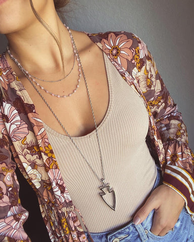 Silver And Gray Dangle Hypoallergenic Nickel Free Pendant Necklace. Custom Silver Ion Plated Stainless Steel Arrowhead Accents And Designed With Love In Texas. Size 32 Inch Length, Plus 3 Inch Attached Necklace Extender With Custom Sizing Available On Select Pieces.