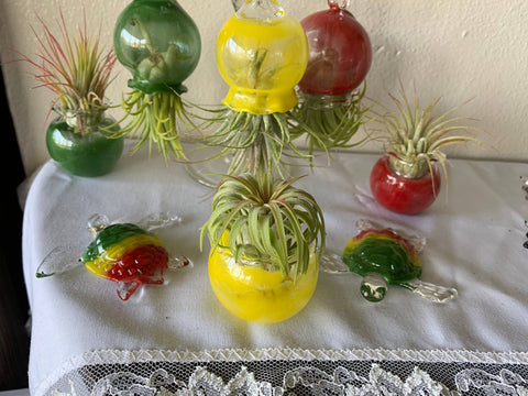 Made from borosilicate glass and comes in a rainbow of colors. The jellyfish come with fancy silver hook for hanging and air plant. The "Air plant" (tillandsia) is a hearty plant that need very little to no water (comes with care card). Each jellyfish is a one-of-kind handcrafted item approx. 2-3".