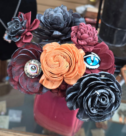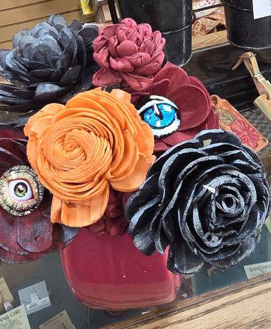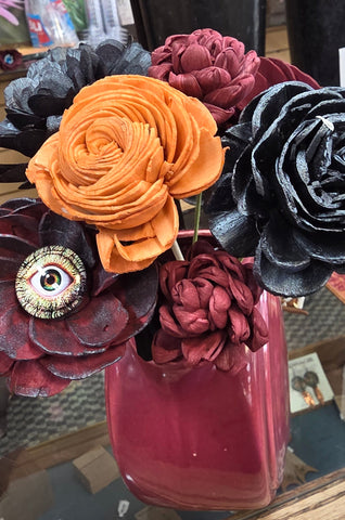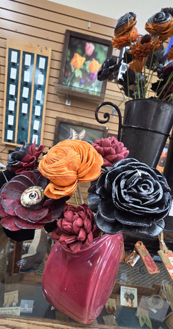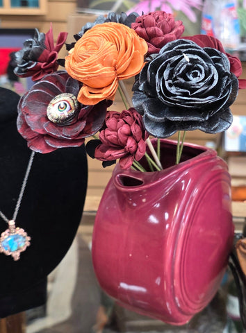 WITH FLOWERS- Make a vintage object a masterpiece with these cool unique wooden flowers by local artisan Kellee! They can be cut to fit any size vase! This special is a twofold! Use as a vase and then when you need a pitcher it is there to be used! Special price for $35 would be $42!